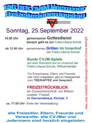 Es ist schon eine lange Tradition. Ein paar Wochen nach unserer CVJM Sommerfreizeit, wollen wir uns nochmal alle zusammenfinden und unseren “Tag des CVJM” feiern. Dieses Jahr wird er am 25. September stattfinden.Wir starten mit einem gemeinsamen Gottesdienst. Der Gottestdienst findet um 10 Uhr in der ev.-ref. Kirche in Neermoor statt. Danach werden wir uns zum Schulhof der Fokko-Ukena-Schule begeben und dort gemeinsam Grillen werden. Wir haben wieder ein buntes Programm mit allerlei Aktivitäten geplant und vorbereitet. Für Erwachsene, Eltern und Freunde gibt es die Gelegenheit zum Tee/Kaffee und Gespräch.Ab ca. 15:30/16:00 werden wir dann im Gemeindehaus unser Freizeitvideo - ein Zusammenschnitt aus Bildern und Videosequenzen unserer Freizeit - zeigen und den Tag des CVJM damit langsam ausklingen lassen.Jedermann ist herzlich eingeladen. Wir freuen uns Euch wieder zu sehen!