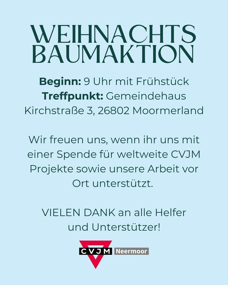 Am Vormittag des 10. Januar 2026 findet wieder unsere traditionelle Weihnachtsbaumaktion statt.Unser engagiertes Mitarbeiterteam sammelt gemeinsam mit vielen fleißigen Helferinnen und Helfern eure ausgedienten Weihnachtsbäume ein. Über eine Spende freuen wir uns sehr – sie unterstützt sowohl weltweite CVJM-Projekte als auch unsere Arbeit hier vor Ort in Neermoor.Wir freuen uns auf eure zahlreiche Unterstützung und sagen bereits jetzt vielen Dank für jede helfende Hand und jede Spende!